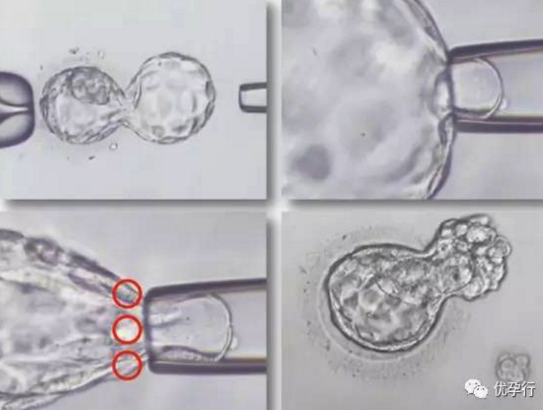 因为此时胚胎已经分成内胚层和外胚层,前者发育成宝宝后者发育成胎盘等,如图所示,在外胚层用镭射枪点3次,取3个细胞,保证其他细胞不受损害,用取出的3个细胞进行检查。