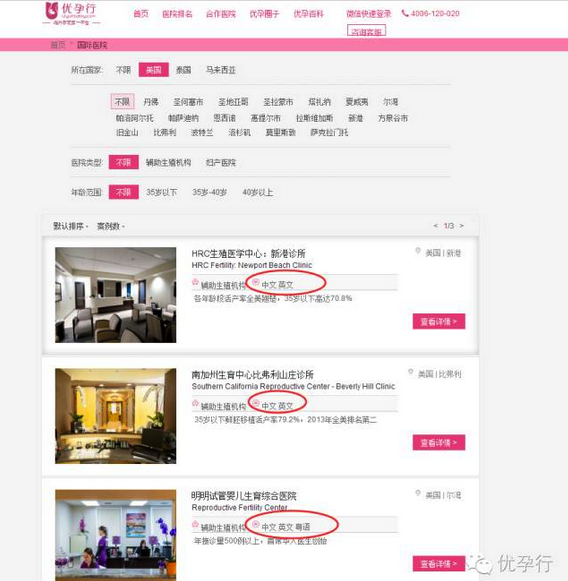 优孕行平台上的很多美国生殖机构配有专业的中文医疗翻译人员,让您在异国他乡完全不受语言的限制。如下图所示,还有一些医院还有设有日语、韩语等医护人员。